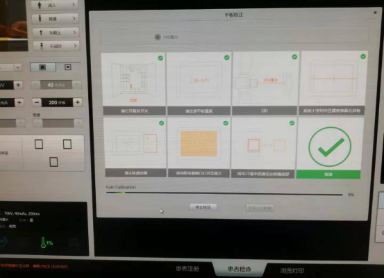 校准前把固定平板前的滤线栅移除,束光器完全包裹平板并插入吕块,把发生器的SW4 服务开关打开,调整SID距离180CM等