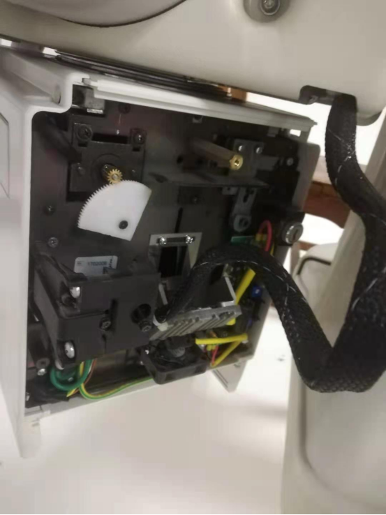 3.把新束光器放在床板上移到球管连接件下方,手下压使连接件和束光器的固定位置刚好吻合,然后用内六角紧固螺丝。完成固定后再把束光器连接线接入并盖上外壳,这样束光器就安装完成,开机测试束光器工作正常,定位灯亮正常