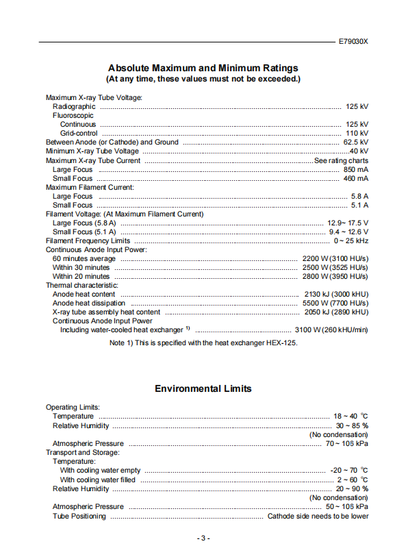 规格参数 : ①大/小焦点尺寸:0.6/1.0; ②最高kv:125kV; ③大/小焦点功率:48kW/100kW; ④靶角:11°; ⑤球管热容量:3000kHU;