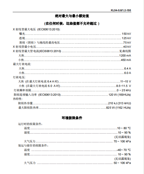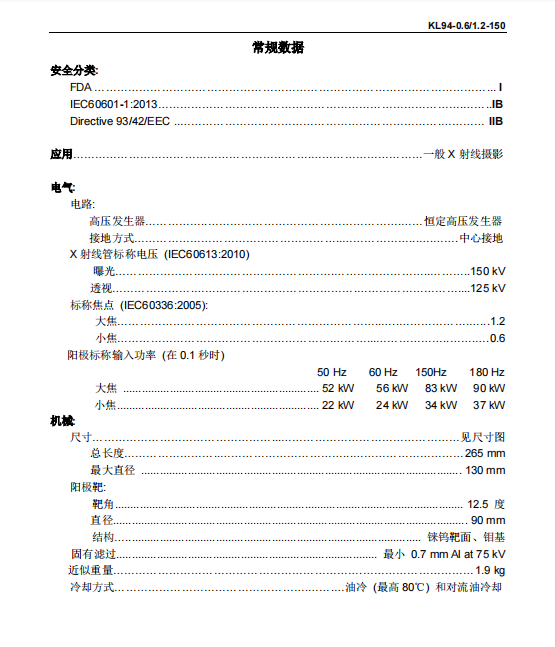 规格参数 : ①大/小焦点尺寸:1.2/0.6; ②最高kv:150kV; ③大/小焦点功率:52kW/22kW; ④靶角:12.5°; ⑤球管热容量:313kHU;