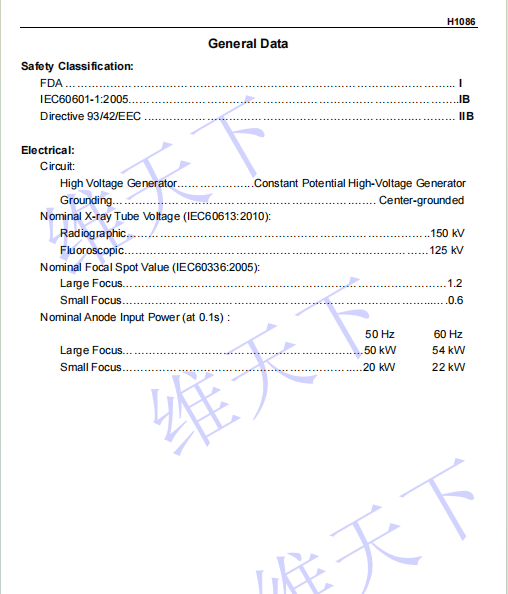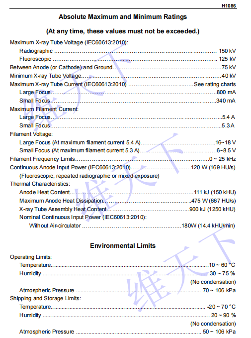 规格参数 : ①大/小焦点尺寸:1.2/0.6; ②最高kv:150kV; ③大/小焦点功率:50kW/20kW; ④靶角:12°; ⑤球管热容量:150kHU;