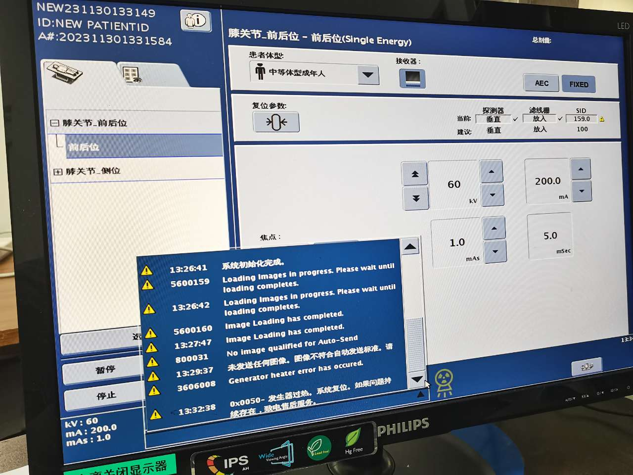3.使用大焦点曝光时一档报错0x0050,查看报错日志提示发生器过热。